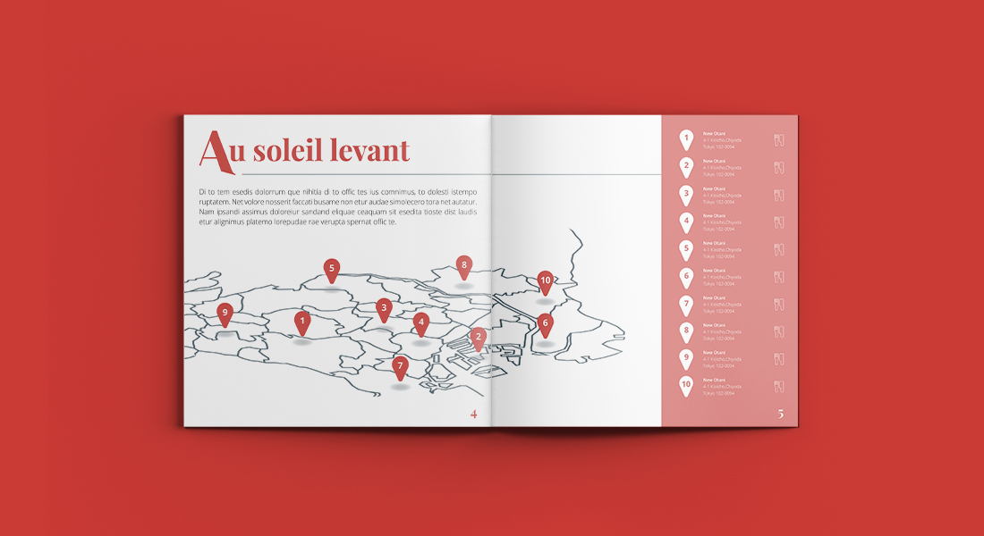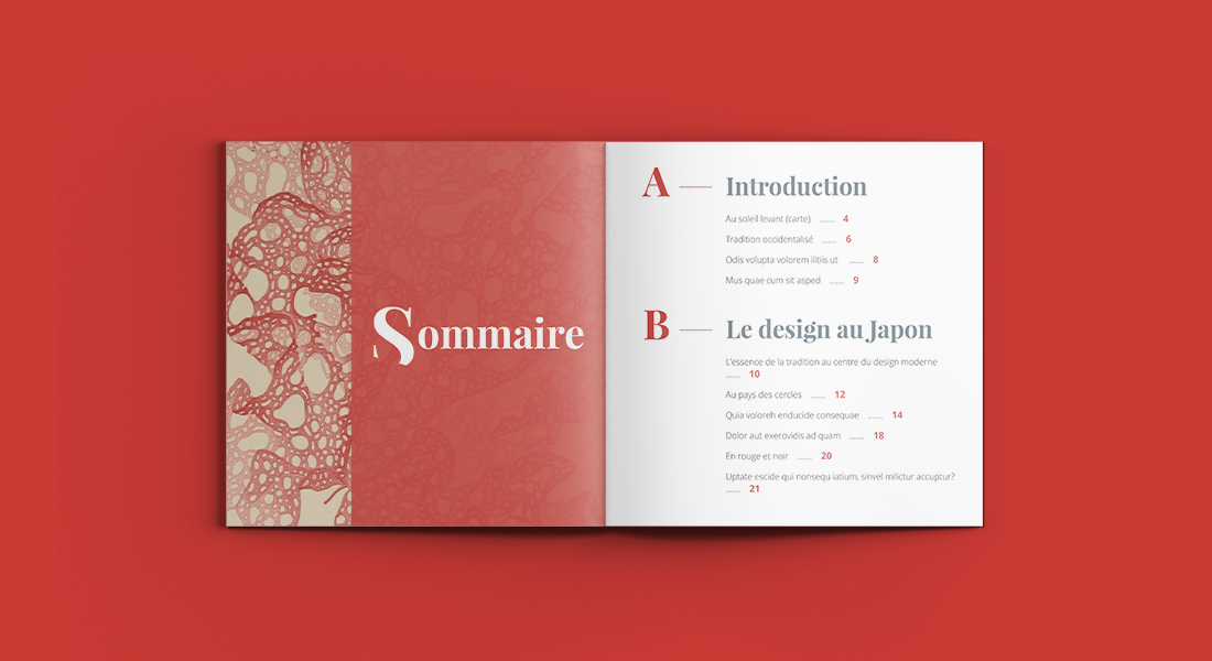Le rouge est donc la couleur dominante sur ce projet, sauf que les première et dernière pages de couverture où une photo de Tokyo la nuit dans les teintes bleues tranche avec le rouge de l’intérieur.