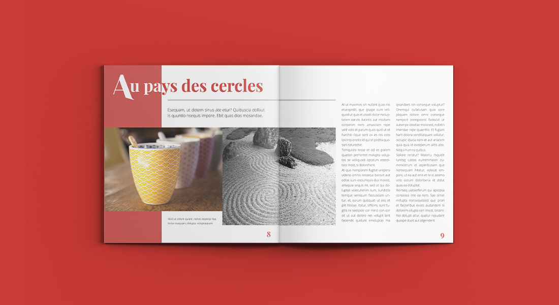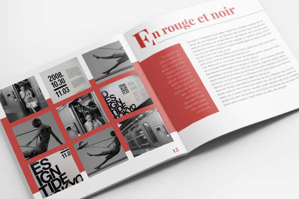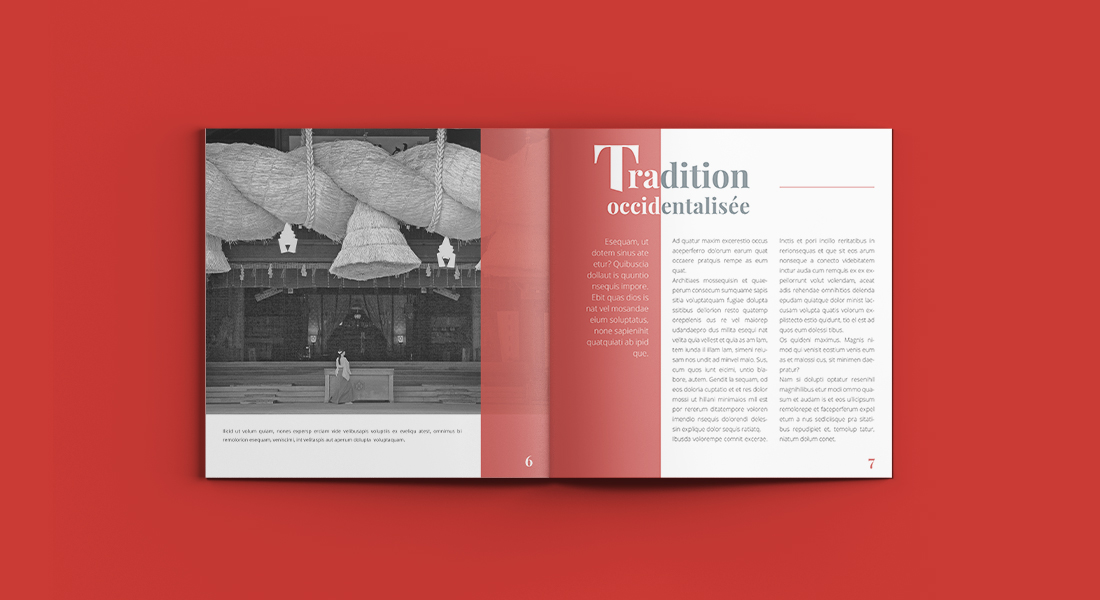 Pour la mise en page, j’ai décidé de partir sur un concept de bandes rouges sur toutes les doubles pages ainsi que les majuscules de titre coupées.